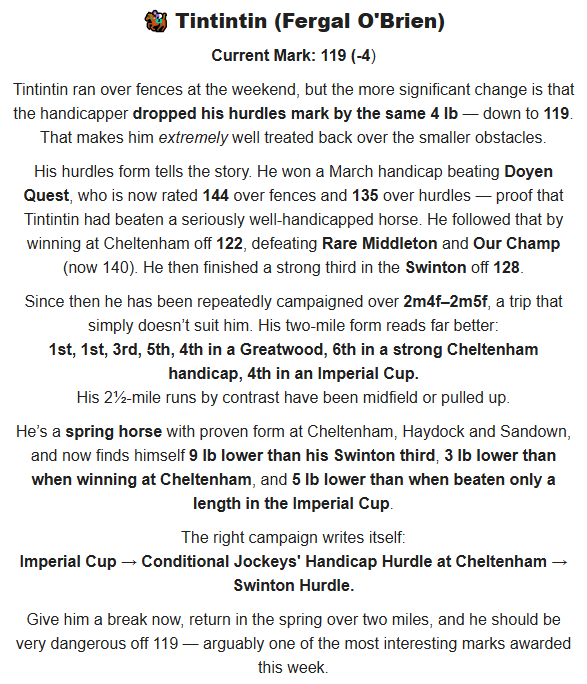 Our Weekly Handicap Analysis, sent exclusively to Premium and Pro members, goes beyond the bare ratings and digs into whether those changes are fair, lenient, harsh, misleading, or downright golden from a betting or long-term planning perspective.
